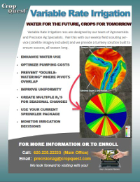Crop Quest (VRI) variable rate irrigation services give you added control over the crop irrigation needs. Crop water is more accurately placed because of automatically adjusting the pivot speed in pies. Our irrigation consultants make it easy to design and execute a VRI plan. So, optimize the irrigation system you already have with a custom built VRI plan and see the difference.